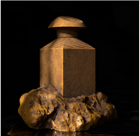 The bottle’s base, inspired by the geometric shape of the sumptuous Bab Agnaou doorway in Marrakech's Kasbah, of royal palatial complexity, rises to a shoulder adorned with brilliant gilding that reflects the reverse of the cap. This subtly light ornament expresses the vernacular and natural effects of the wind blowing across the sand dunes of the seemingly endless Moroccan Sahara desert.